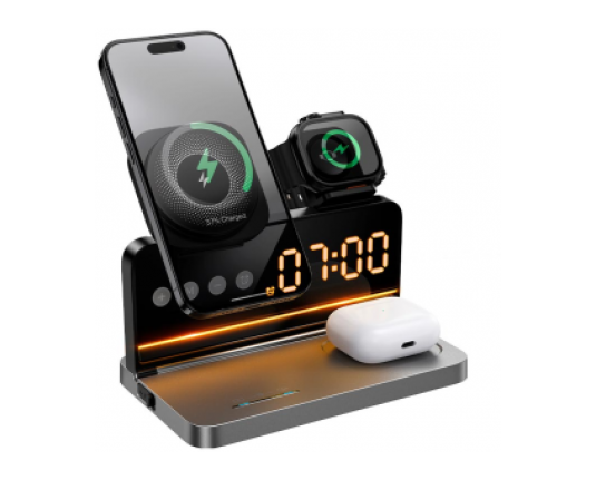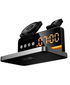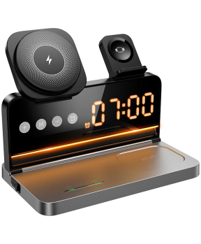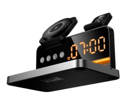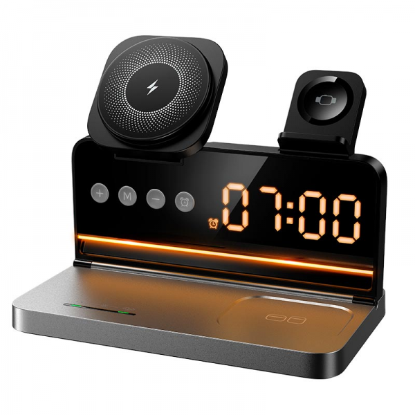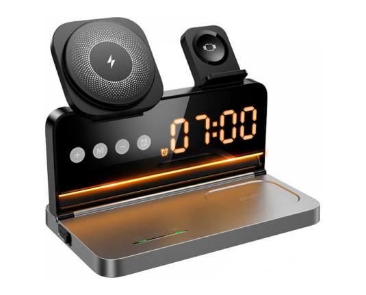 HOCO DWQ03 4v1 brezžični polnilec omogoča hkratno polnjenje telefona, slušalk in ure. Ima digitalno uro z alarmom in kompakten dizajn.
