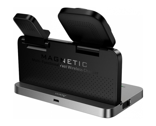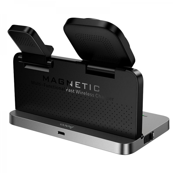 Vse na enem mestu. HOCO DWQ03 je pametna polnilna postaja, ki združuje brezžično polnjenje za telefon, slušalke in pametno uro – plus digitalno uro z alarmom.