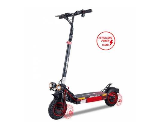 E-Cross Max je predstavnik najnovejše in najzmogljivejše serije električnih skirojev E-Cross blagovne znamke UrbanGlide. Predstavlja pravo kombinacijo dosega, udobja in moči. Njegova glavna lastnost je dvojni motor (pogon spredaj in zadaj). Z aktiviranjem dvojnega motorja lahko izkoristite do 2 x 800 W moči in uživate v neverjetnem pospeševanju ter navoru, z lahkoto pa se spopadete tudi z zahtevnejšim terenom. Vožnja je izjemno mehka in udobna. Skiro je opremljen s 17,5 Ah litijevo baterijo in ima doseg do 70 km (odvisno od terena in teže uporabnika). Opremljen je tudi z dvema disk zavorama spredaj in zadaj, dvojno sprednjo lučjo, svetlobnimi stranskimi trakovi ter zadnjo lučjo, zato ga lahko uporabljate tudi v urbanem okolju. E-Cross Max ima zelo široko stojno površino in je popolnoma vzmeten; sprednja vilica s 4 vzmetmi in zadnja vilica z 2 vzmetema. Poleg tega lahko enostavno prilagodite višino teleskopskega krmila (visok položaj: 130 cm; nizek položaj: 100 cm), zato je primeren tudi za višje uporabnike. Na zaslonu LCD lahko nadzorujete in prilagodite hitrost - na voljo so 3 stopnje hitrosti (od 6 km/h do 25 km/h). Na zaslonu lahko dostopate tudi do podatkov o potovanju: hitrosti, prevoženi razdalji, stanju baterije, itd. Kljub svoji impozantni velikosti (121 x 60,5 x 106 cm) je UrbanGlide opremil E-Cross Max z zložljivimi ročaji in teleskopskim krmilom, da bi optimiziral njegovo shranjevanje. Ko je zložen, ga je mogoče diskretno shraniti, saj so njegove dimenzije 121 x 24,5 x 43 cm. E-Cross Max je zmogljiv, robustni električni skiro atraktivnega videza, namenjen predvsem zahtevnejšim uporabnikom.