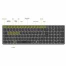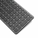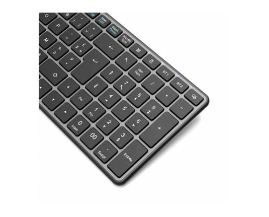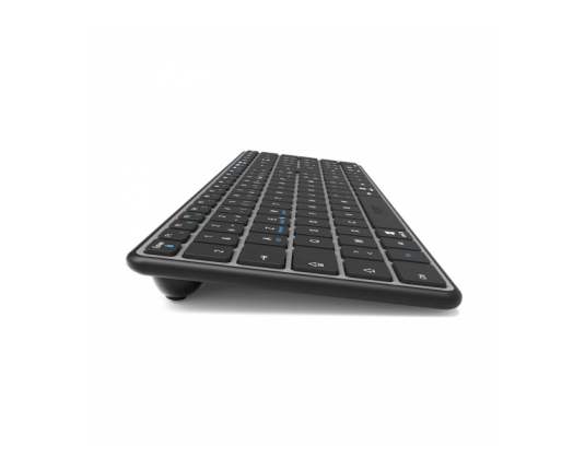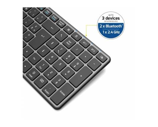 Napredna SLO brezžična tipkovnica za več naprav Tipkovnica omogoča dvojno povezljivost z 2,4 GHz brezžično tehnologijo in Bluetooth® 5.0 BLE, kar zagotavlja stabilno in zanesljivo povezavo z različnimi napravami. Z možnostjo večnapravnega preklapljanja lahko enostavno povežete in upravljate do 3 naprave hkrati, kar bistveno poveča vašo produktivnost. Polnjenje prek USB-C omogoča hitro, preprosto in priročno uporabo brez potrebe po menjavi baterij. Z dosegom do 10 metrov nudi popolno svobodo gibanja brez izgube povezave. Napredna BLE tehnologija z varčnimi načini delovanja pa zagotavlja dolgo življenjsko dobo baterije. Tipkovnica vključuje tudi pregledne navigacijske in multimedijske funkcije ter LED indikatorje za prikaz stanja (velike črke, številčnica, drsenje) in izbiro naprave.